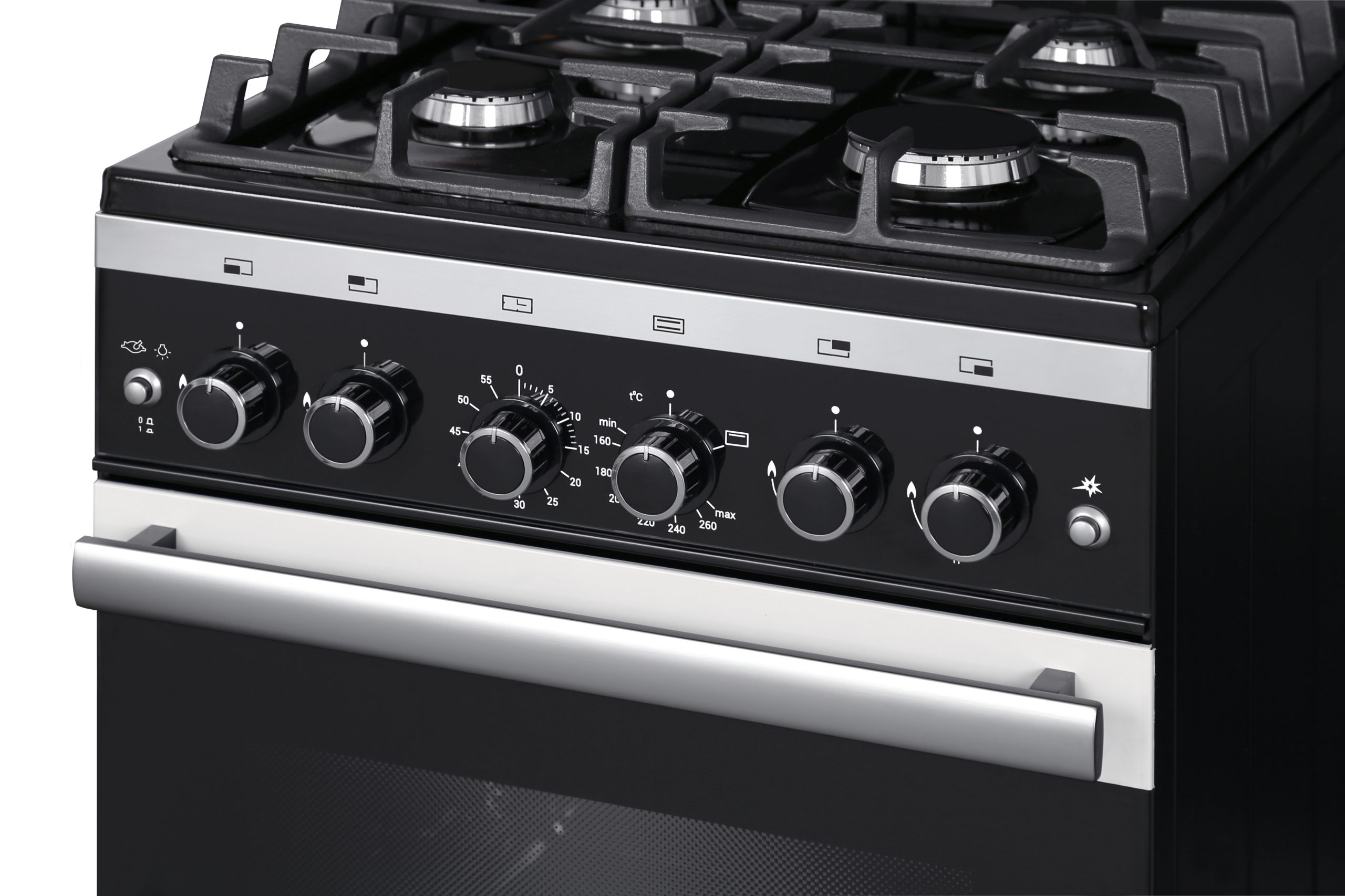 Таймер механический, газ-контроль духовки, электророзжиг горелок духовки и стола, кнопка розжига на панели управления, гриль-горелка, вертел с электроприводом, одинарная подсветка духовки, съемные проволочные направляющие, терморегулятор духовки, выдвижной ящик, регулировочные ножки. Фасад стеклянный, стол из жаропрочного стекла, чугунные решетки. Полезный объем духовки — 52 литра. фасад стеклянный черный с накладками из нержавеющей стали